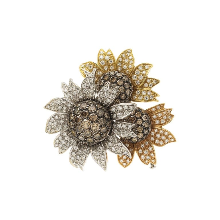 Solros brooch in white gold, rose gold and yellow gold with flower diamonds