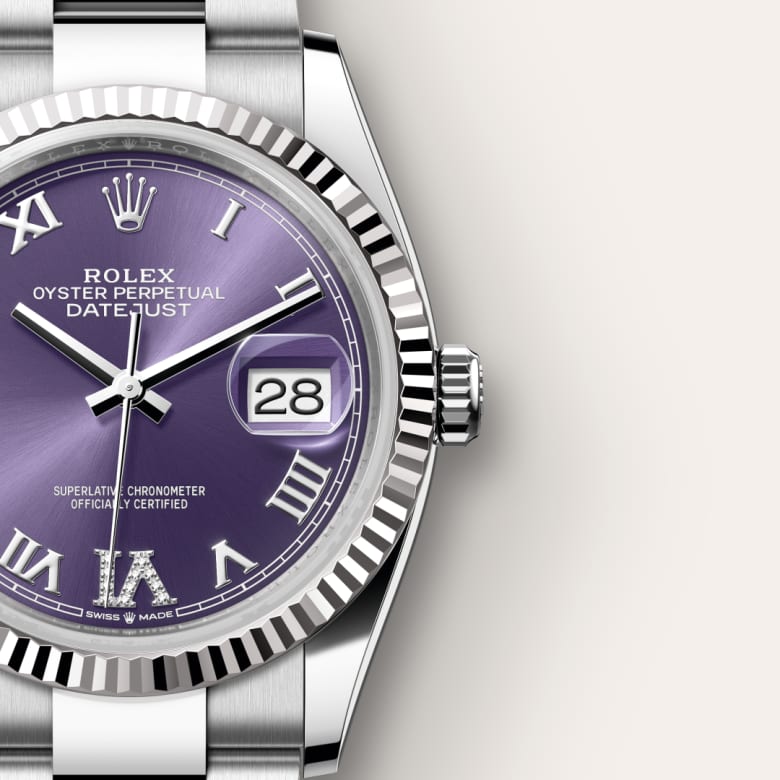This dial features a Roman VI and IX in 18 ct gold, set with 24 diamonds. The sunray finish creates delicate light reflections on many dials in the Oyster Perpetual collection. It is obtained using masterful brushing techniques that create grooves running outwards from the centre of the dial. Light is diffused consistently along each engraving, creating a characteristic subtle glow that moves depending on the position of the wrist. Once the sunray finish has been completed, the dial colour is applied using Physical Vapour Deposition or electroplating. A light coat of varnish gives the dial its final look.